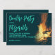 Modelo de convite de festas de de fogueira do quintal. Um design de fogo em chamas com fundo azul muito escuro e texto amarelo. O título da parte e o nome / local do texto são um script grande. Este convite horizontal é perfeito para uma reunião casual com amigos ou para celebrar um aniversário.