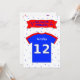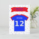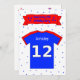 Na frente deste convite de festas divertido há uma grande faixa vermelha de aniversário com a mensagem "Venha à minha festa de aniversário 12". A camisa vermelha e azul no estilo esportivo, com um grande número branco 12, está pronta para você personalizar com um nome. No verso do cartão há muitas linhas para detalhes da parte. Esta é uma design colorida, ideal para rapazes e raparigas.