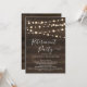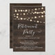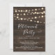 Convite de festas de aposentadoria — luzes de cordas em um fundo de madeira rústica complementado por uma bela caligrafia. A redação foi incorporada para uma festa surpresa, embora essa informação possa ser facilmente editada se a sua celebração não for surpresa.