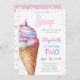 Duas colheres bonitas e coloridas de convite de aniversário divertido para a menina. Isso é vibrante com roxo e rosa com cone de sorvete número 2 com muitos borrifos.