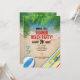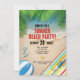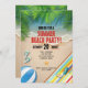 Divirta-se ao sol com este convite de festas de verão de praia tropical. As coisas que você precisará para a praia, incluindo uma toalha de praia, óculos escuros, loção solar, chinelos (pinos), e uma bola de praia estão posicionadas perto de onde as ondas do oceano encontram a praia arenosa sob as folhas tropicais de palma. Versátil para um tema de praia ou festa de aniversário de verão, solteira ou despedida de solteiro, assar de vírgula, CHURRASCO ou mesmo uma festa de noivado ou chá de panela casual de praia. Disponível com produtos correspondentes.