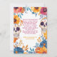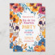 Apresentando um convite de festas vibrante e festivo Día de Muertos, projetado para capturar a alegria e a cor dessa celebração amada. O convite apresenta um fundo branco limpo, proporcionando uma canvas brilhante e nova para os designs vivos. Em ambos os lados do convite, dois crânios de açúcar maravilhosamente decorados ocupam o palco central. Esses crânios de açúcar são enfeitados com padrões intrincados e cores vibrantes, criando um aspecto festivo e tradicional. Ao redor dos crânios de açúcar estão aglomerados de flores cor-de-rosa, amarelas e azuis, adicionando um pop de cor e criando uma atmosfera alegre e celebratória. Os elementos florais harmonizam-se com os crânios de açúcar, dando ao convite uma sensação equilibrada e coesa. O verso do convite continua o fundo branco, com espaço para texto personalizável. Aqui, você pode adicionar detalhes do evento, uma mensagem pessoal e uma linha RSVP, todas moldadas pelo mesmo design de crânio floral e de açúcar para um toque consistente e elegante. Com seus brilhantes crânios de açúcar, sotaques florais coloridos e fundo branco limpo, este convite Día de Muertos é a forma perfeita de dar o tom a uma celebração alegre e vibrante que honra a tradição e junta as pessoas.