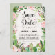 Convite de salva de data de festa rústica com suculentas de aquarela, rosas rosa e letra caligráfica moderna.