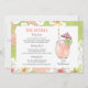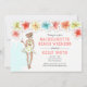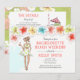 Convite de Fim de Semana de Férias de Despedida de Solteira na Praia com tema tropical com flores de hibisco e noiva loira para ser festejada curtindo um coquetel. Disponível com garota loira, morena, ruiva e com pele clara ou escura. O verso do convite apresenta um coquetel e detalhes.