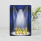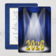 Convite da cerimônia de formatura para a turma de 2026 em azul e dourado no palco com holofotes.