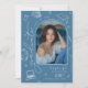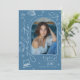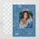 Um anúncio de formatura que é uma mistura de capricho e charme retrô. Adornado com ilustrações desenhadas à mão no estilo de rabiscos, este design em azul e branco empoeirado mistura uma paleta de cores clássica com uma vibe fresca e divertida. Os desenhos criativos - um capelo de formatura, laptop, mochila, livros, café, lápis, diploma, balão e estrelas - adicionam um toque de leveza à sua grande conquista, tornando-a atual e exclusivamente sua. Cada elemento pode ser redimensionado, reposicionado ou excluído, se desejado. A escrita manuscrita do graduando cria uma moldura em torno da sua foto. Personalize o modelo com seu ano, nome e escola. © Kimbellished, LLC