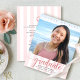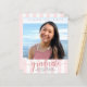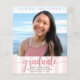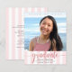 Orgulhe-se, regozije-se e anuncie ao mundo que seu graduado favorito alcançou sua meta com este convite de anúncio de orçamento personalizado, simples, moderno e deslumbrante. Caligrafia brilhante, elegante e com brilho dourado rosa falso, tipografia cinza sem serifa e uma foto de sua escolha sobreposta a um fundo listrado de rosa claro e branco. Personalize o texto personalizado com o nome do seu graduado, nome da escola, ano de turma e data de formatura. No verso, adicione sua nota pessoal, próxima escola que eles estão frequentando, informações do evento, etc. Garantido para adicionar diversão estilosa à sua ocasião especial!