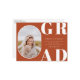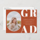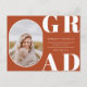 Moldura de foto frontal arredondada, convite/anúncio de formatura da turma sênior. Cor laranja enferrujado sólido de fundo, tipo negrito branco "GRAD" e linhas de modelo de texto para o nome do formando, turma do ano e escola. O verso do cartão apresenta linhas de texto adicionais para informações da festa ou outras informações sobre o formando.