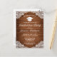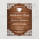 Convite de formatura em cartão postal. Estilo rústico com fundo de tábuas de madeira marrom e decoração de renda branca.
