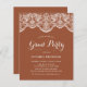 Vamos celebrar o formando! Convide os convidados para o seu evento com este convite de formatura personalizável. Ele apresenta uma escrita rústica e renda de brocado branco. Personalize-o adicionando seus detalhes. Este convite de formatura em terracota elegante também está disponível em outros tipos de papel e cores.
