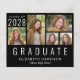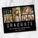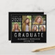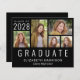 Convite de formatura preto acessível para ele ou ela, apresentando uma colagem de 5 fotos e "Graduado" escrito na parte inferior em letras maiúsculas brancas grandes. Adicione o ano de conclusão, nome e escola ou universidade em tipografia branca simples.