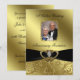 Um design de imagens Digitalbcon com um tema de floreio preto e dourado com uma variedade de imagens personalizadas, formas, padrões, estilos e fontes neste convite de cartão de aniversário de bodas de ouro único. Este convite elegante e atraente vem completo com um design correspondente no verso com letras de texto personalizadas e uma foto personalizável do casal de aniversário para se adequar à sua ocasião especial.