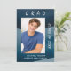 Um cartão de convite de formatura elegante e de dois lados construído em torno de azuis profundos do oceano e bloqueio de cores geométricas - com uma janela de foto com acabamento dourado na frente e um layout limpo de detalhes da festa no verso. Projetado para o graduado que deseja algo sofisticado e memorável, funciona lindamente tanto como um anúncio de recordação quanto como um convite formal de festa enviado à família e amigos. Essa paleta azul em camadas e a letra pincelada em negrito "GRAD" lhe dão uma confiança que a maioria dos modelos simplesmente não tem.