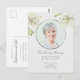 Este convite moderno e elegante de Celebração da Vida em formato de cartão postal mostra uma foto de seu ente querido emoldurada por uma moldura prateada sofisticada e ilustrações vintage de lindos lírios. A textura leve do papel adiciona um toque caloroso. Personalize todos os títulos e mensagens ao seu gosto. Produtos correspondentes, como livros de visita, velas, etc., estão disponíveis em nossa coleção "Funeral de Lírios Botânicos Vintage".