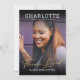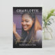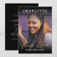 Convite de celebração de vida elegante com foto da pessoa que está sendo lembrada, uma sobreposição preta, a frase de condolências "para sempre amado, nunca esquecido", e um modelo de texto moderno fácil de personalizar.