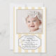 Listras alternadas de creme e branco e um painel decorativo abaixo da janela da foto criam este convite lindo e unissex. A cruz em destaque pode ser arrastada para qualquer local, aumentada ou diminuída (+-) ou eliminada.