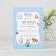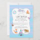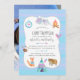Convite de festas de tipografia elegante Camping com um urso florestal, uma raposa, uma árvore, e uma ave com sotaques geométricos.
