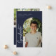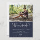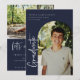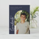 "formando" moderno com script, anúncio/convite para a graduação de fotos em arco. Recursos, tipografia branca em fundo azul marinho.