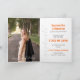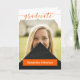 O roteiro elegante anuncia seu formando sobre sua foto favorita do mais velho na frente. Bloquear o nome deles na frente, e todos os detalhes da cerimônia, dentro junto com outra foto. A parte traseira inclui espaço para retransmitir seus planos futuros ou incluir uma mensagem de obrigado. Design disponível nas cores da escola de vermelho, laranja, roxo, verde, azul, laranja queimada, marrom e preto. Produtos correspondentes disponíveis.