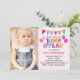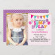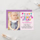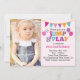 Nosso convite colorido ao estilo de fotos Jump & Play Balloons em cores rosa e roxo apresenta letras coloridas, padrões e balões e faz um convite perfeito para qualquer festa de criança com um tema de casa de salto, trampolim ou salto e brincadeira.