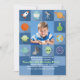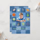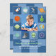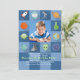 Um convite perfeito para o aniversário do seu entusiasta espacial. O padrão azul da prancha de xadrez em azul apresenta ícones relacionados ao espaço e uma janela de fotos central.