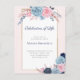 Um design floral elegante com rosas em tons de rosa, azul-marinho e azul poeirento, em um fundo rosado.