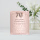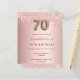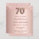 Um convite moderno, elegante e glamoroso para uma festa de 70 anos. Um fundo com aparência metálica em dourado rosa falso com um efeito de gotejamento de purpurina dourado rosa falso e pintura elegante. O nome é escrito com um estilo de letra manuscrita moderna em cor dourado rosa escuro. Personalize e adicione os detalhes da sua festa. O número 70 é escrito com uma fonte estilo balão, manuscrita.