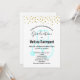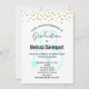 Um convite para uma celebração de formatura em enfermagem. Projetado com pontos de confete dourado falso ao longo da parte superior. Um estetoscópio azul pastel atrás do texto da festa. Design minimalista simples.
