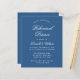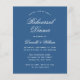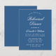 Um convite de jantar de ensaio azul clássico. É simples, apenas texto branco em fundo azul. As palavras "Jantar de Ensaio" e o nome estão escritos em uma elegante caligrafia.