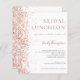 Uma alternativa de orçamento com bom custo-benefício em um tamanho menor 4,5 x 5,6” semi-brilho com 110lbs de peso, que tem uma espessura semelhante à de um cartão postal (no entanto, não é adequado para uso como cartão postal). POR FAVOR, OBSERVE que há UM convite por folha. Convite de Almoço de Noiva com Brilho Dourado Rosa com Orçamento. Uma borda de brilho dourado rosa está no lado esquerdo em ambos os lados e a tipografia moderna está alinhada à direita na frente, que você pode personalizar facilmente.