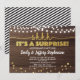 Elegante convite de festa surpresa dourado com desenho de luzes sobre um fundo de madeira rústica. Muito sofisticado.
