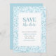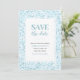 Convite de salvar a data em um padrão de mosaico azul aqua.