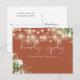 Um convite de música elegante com folhagens florais, luzes de corda e tipografia sofisticada em um fundo de terracota. O verso apresenta seus detalhes e um divertido pedido de música para os convidados. Criado por Thisisnotme