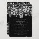 Modelo de convite de "Casamento de Natal Prata e Preto para Salvar a Data" moderno e elegante, com flocos de neve prateados brilhantes e luzes em fundo preto.