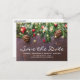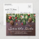 Cartões-postais de convite de casamento rústico country save the date com fundo de madeira escura, galhos de árvore de Natal festivos, enfeites de árvore vermelhos e dourados, luzes cintilantes e um modelo de texto fácil de personalizar.