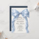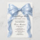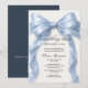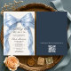 Convite de noivado elegante com 'Something Blue Before I Do' apresentando um delicado design de laço e um código QR moderno para fácil RSVP ou acesso ao registro. Perfeito para celebrar a noiva com um estilo atemporal e feminino e opção de resposta digital conveniente. Ideal para chás de noiva e celebrações pré-casamento. Texto e destino do QR editáveis. Layout pronto para impressão.