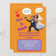 Fora do design convencional, representando um casal de noivos em estilo cartoon, celebrando alegremente seu momento, adicionando elementos para tornar a composição com visual chamativo e engraçado. Cartão personalizável.