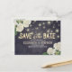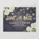 Modelos de Cartão Postal de Convite de Casamento Save The Date - Elegantes Flores de Hortênsia Brancas e Luzes de Corda em Fundo de Linho Floral Azul Marinho Vintage.