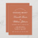 Um simples convite de festa de noivado com uma cor moderna: terracota (um marrom-avermelhado). Tem apenas texto branco sobre um fundo terracota. Os nomes são escritos em uma fonte caligráfica elegante, o resto em maiúsculas. A primeira linha é um texto arqueado.