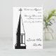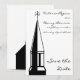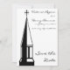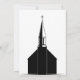 Um convite de noivado com uma ilustração gráfica em preto e branco de uma torre de igreja e cruz. O verso apresenta uma igreja simplificada.