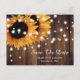 Estes cartões-postais de casamento em madeira rústica para guardar a data do casamento com girassóis em um fundo de madeira de celeiro são ideais para uma festa de casamento rústica inspirada em girassóis.