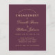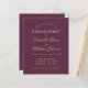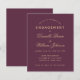 Um convite simples e econômico para festa de noivado. Tem apenas texto dourado sobre fundo cor de vinho (próximo ao burgundy). Os nomes são escritos em uma fonte caligráfica elegante, o restante em maiúsculas. A primeira linha é um texto arqueado.