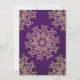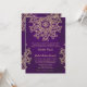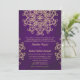 Um belo convite de casamento roxo ametista e dourado com um padrão exótico de medalhão de sari inspirado na Índia, com um design floral e de explosão de lótus. Este convite de casamento elegante e moderno no estilo indiano é perfeito para qualquer ocasião formal com tema de noite árabe, aladim marroquino ou leste asiático indonésio. Criado pela Chrissy H. Studios, LLC. Todos os direitos reservados.