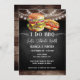 Convites de noivado para casal que gosta de churrasco. Fácil de personalizar. Todo o texto é ajustável e fácil de alterar para as necessidades da sua festa. Elementos rústicos de fundo com luzes de corda. Redemoinhos e floreios divertidos em quadro-negro. Gráficos de hambúrguer e cachorro-quente em aquarela. Design de festa de churrasco no bar ou quintal. Qualquer idade, basta mudar o texto.