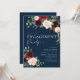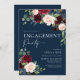Convite de festa de noivado floral Boho Navy Burgundy e Blush. Este convite é caracterizado por rosas e flores boho burgundy e blush com duas fontes modernas de alta classe que moldam as tendências dos eventos festivos presentes e futuros.