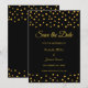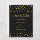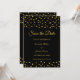 Cartão de Convite de Noivado com Confetes Elegantes de Metalizado Dourado sobre Preto.