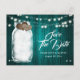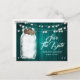 Convite de noivado rústico romântico em azul turquesa com cartão postal apresentando uma jarra de pedreiro e dois corações de aniagem contra um fundo de madeira rústica adornado com luzes de corda.