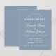 Um convite de festa de noivado simples com uma cor moderna: azul poeira. Tem apenas texto branco sobre fundo azul poeira. Os nomes são escritos em uma fonte caligráfica elegante, o restante em maiúsculas. a primeira linha é um texto arqueado.