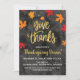Dê aos Obrigados com folhas caídas convite de Ação de Graças. Na frente está a frase "dar obrigados" em placas gráficas de folha de ouro escritas em script com galhos decorativos. O fundo é um papel de aquarela em preto com alças de cobre. É decorado com folhas caídas em laranja, amarelo e vermelho que enquadram as palavras "dar obrigados". O verso do convite é um papel cor de laranja/dourado com flores e folhas impressas em ouro. Você pode editar todo o texto com seus detalhes, exceto a imagem "dar obrigados".