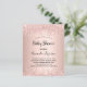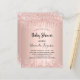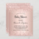 Para um chá de fraldas, comemorando uma menina. Um fundo de aparência metálica falsa rosa dourado. Decorado com rosa dourado, brilho rosado, pintura pingando. Modelos para o nome da mãe e detalhes da festa. O nome e o texto: Chá de fraldas são escritos com um script de estilo manuscrito